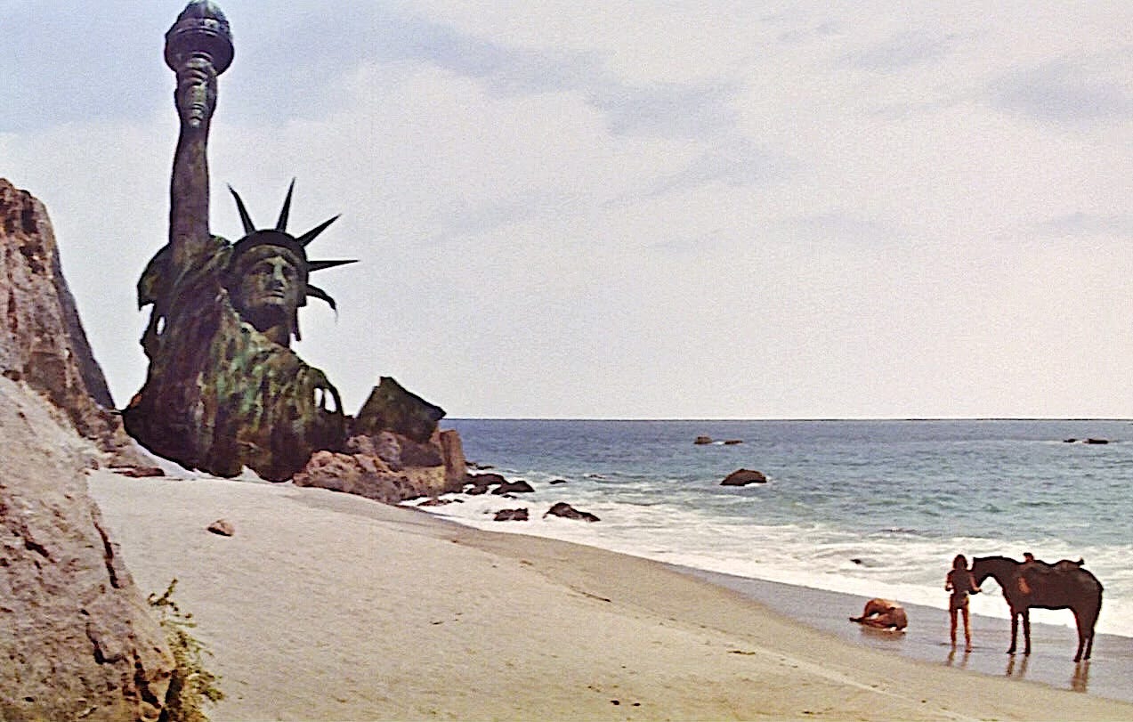 Iconic image from the 1968 version of Planet of the Apes, with Charlton Heston, Linda Harrison, and a horse.